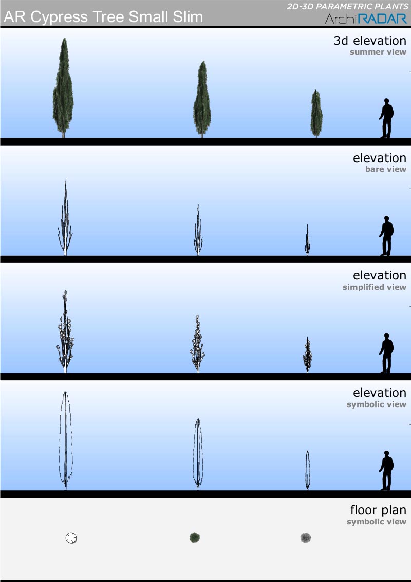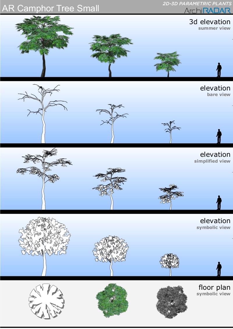 The objects are made with a low polygon quantity, they have a real growing factor according to the size and a corresponding symbolic view in elevation. Optimized for BIMX.